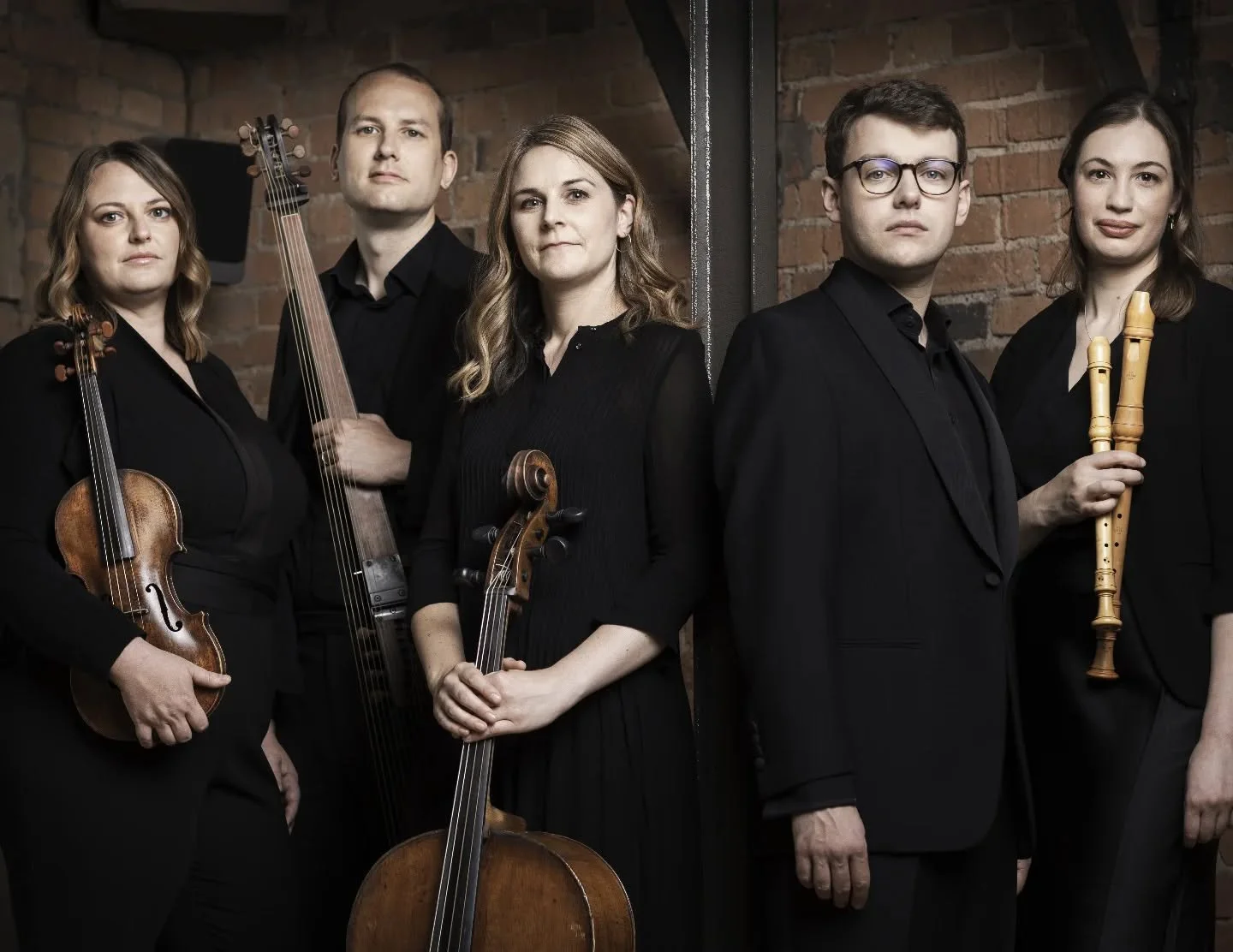 We are Olwen (recorders), Ellen (violin), Carina (cello), Toby (theorbo), Benedict (harpsichord).